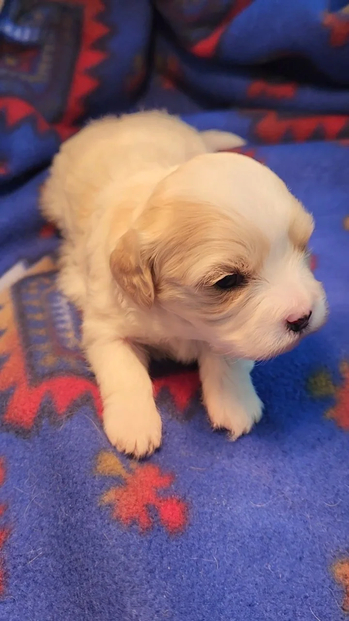 Puppy Note: -Candy First generations Cavachon. Her mom is Daisy, my Bichon. she is 14 lbs and Dad is Charlies, my tricolor Cavalier King Charlies. he is 15 lbs.