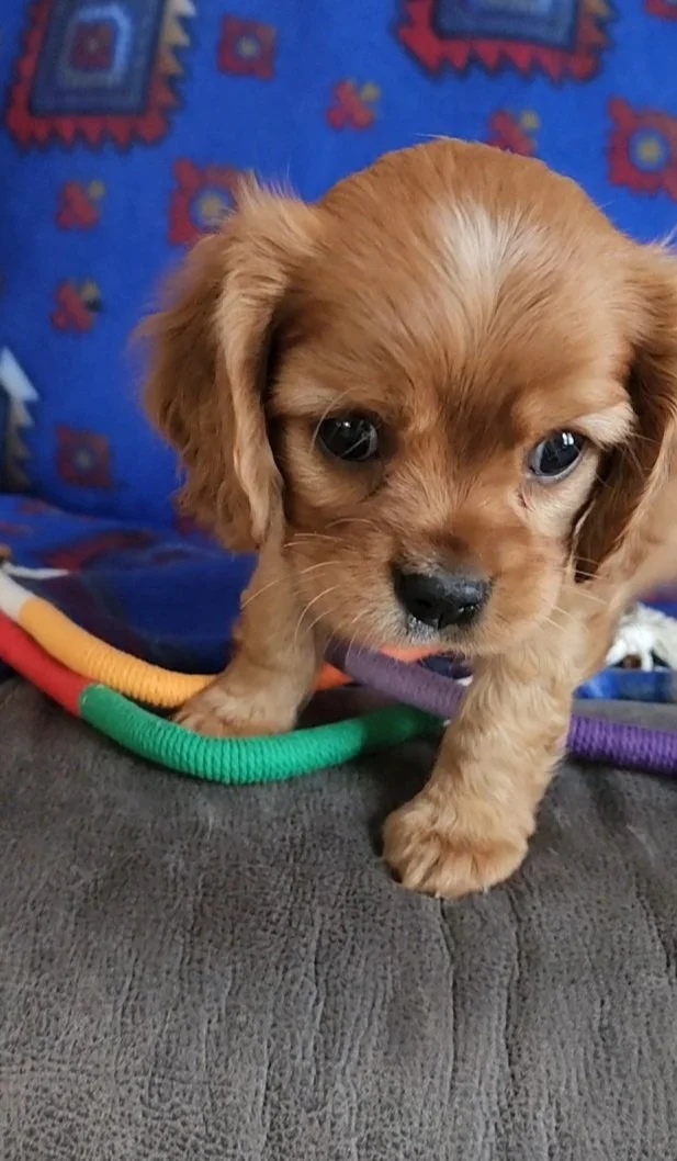 Puppy Note: -She is Ruby with a white kiss. Molly is the daughter of Elizabeth and Chief. Elizabeth is Blenheim Cavalier King Charles. and , Chief is a Ruby, Cavalier King Charles. Elizabeth is 15lbs and Chief is 17 lbs.